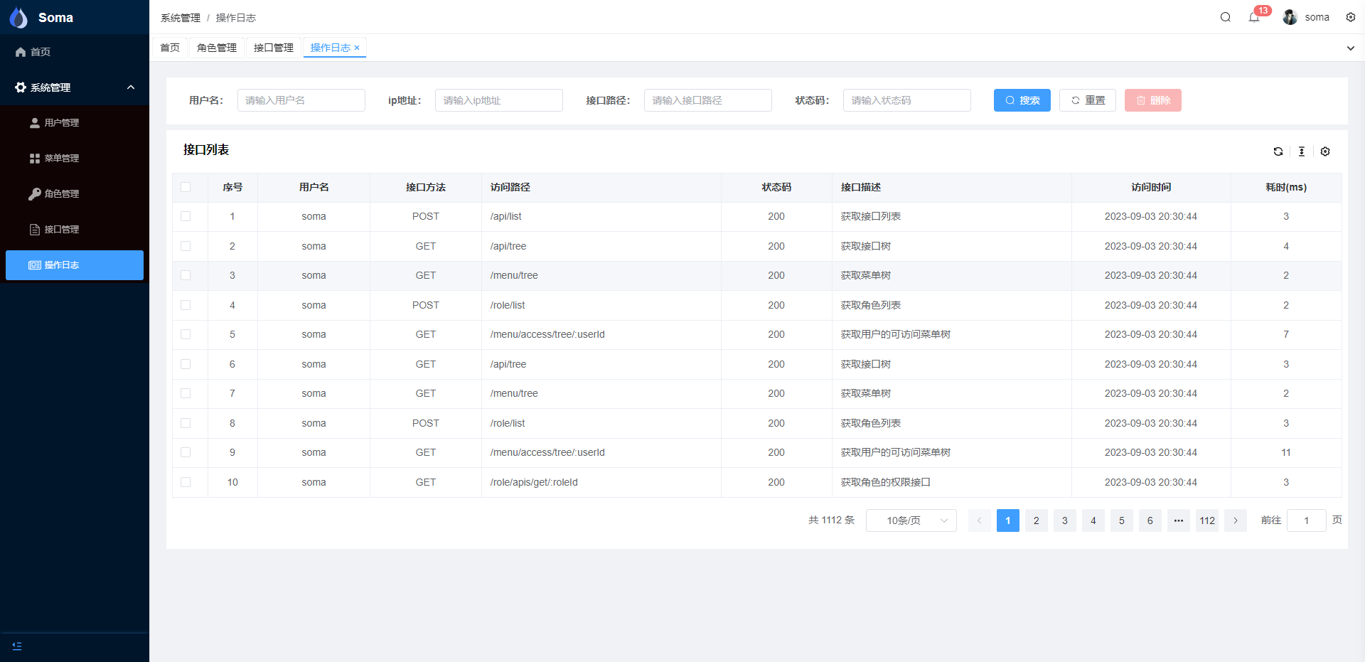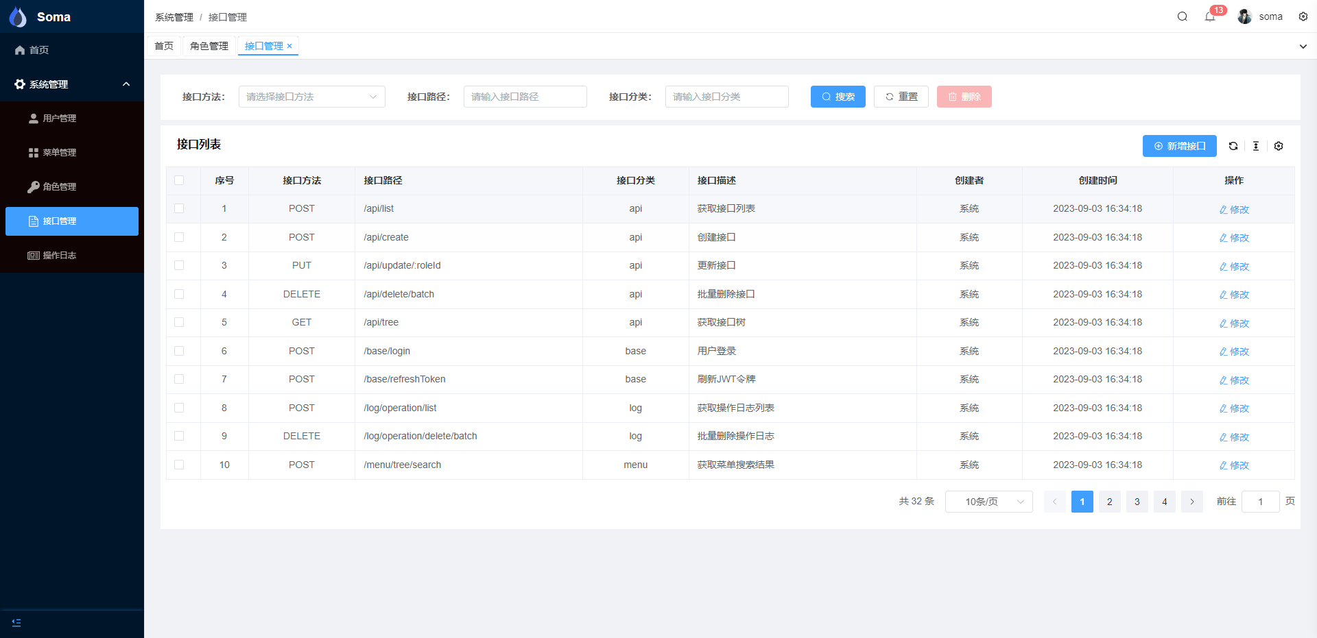 接口管理:管理后台系统的接口管理,与权限控制相关。