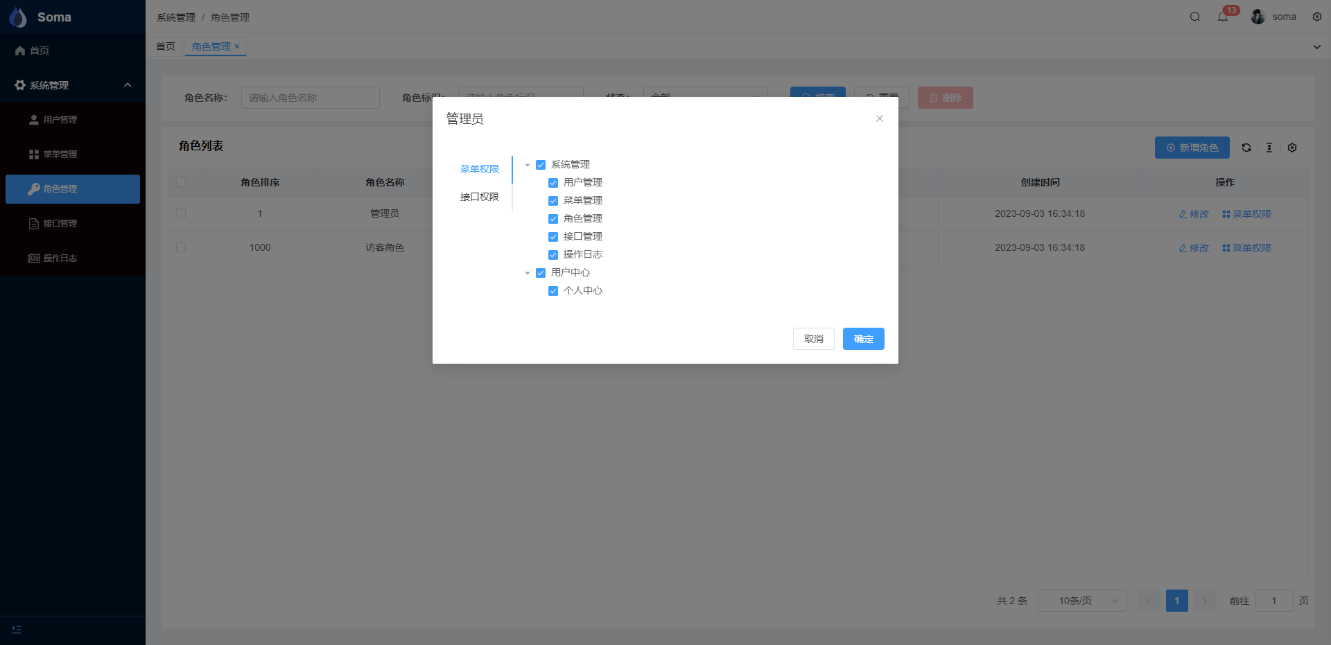 角色管理:对权限与菜单进行分配,可根据部门设置角色的数据权限。