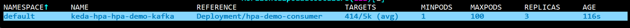 apiVersion:keda.sh/v1alpha1kind:ScaledObjectmetadata:name:hpa-demo-kafkanamespace:defaultspec:scaleTargetRef:name:hpa-demo-consumerpollingInterval:30minReplicaCount:1# Pod 数量不能大于分区数maxReplicaCount:3triggers:- type:kafkametadata:bootstrapServers:192.168.21.3:9093consumerGroup:hpa-demo-grouptopic:hpa-demo-topic# OptionallagThreshold:"5000"offsetResetPolicy:latest