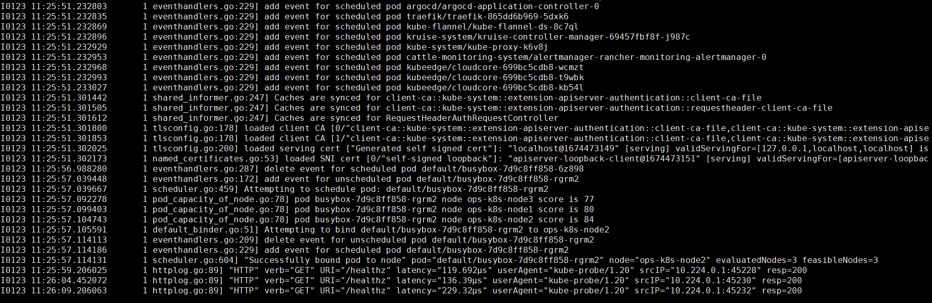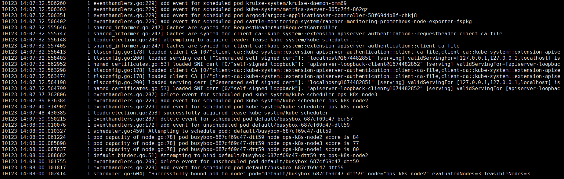 根据日志可以看出,worker 节点上面的 Pods 个数影响到此次调度,使 Pod 被调度到 node2 节点上。