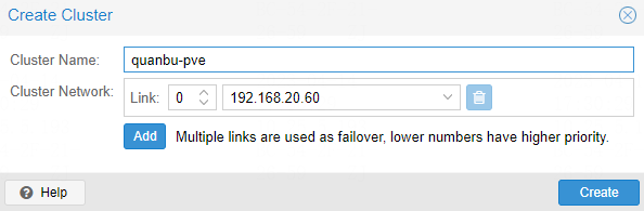 在现有的 pve 服务器上创建集群。Datacenter –> Cluster –> Create Cluster 。