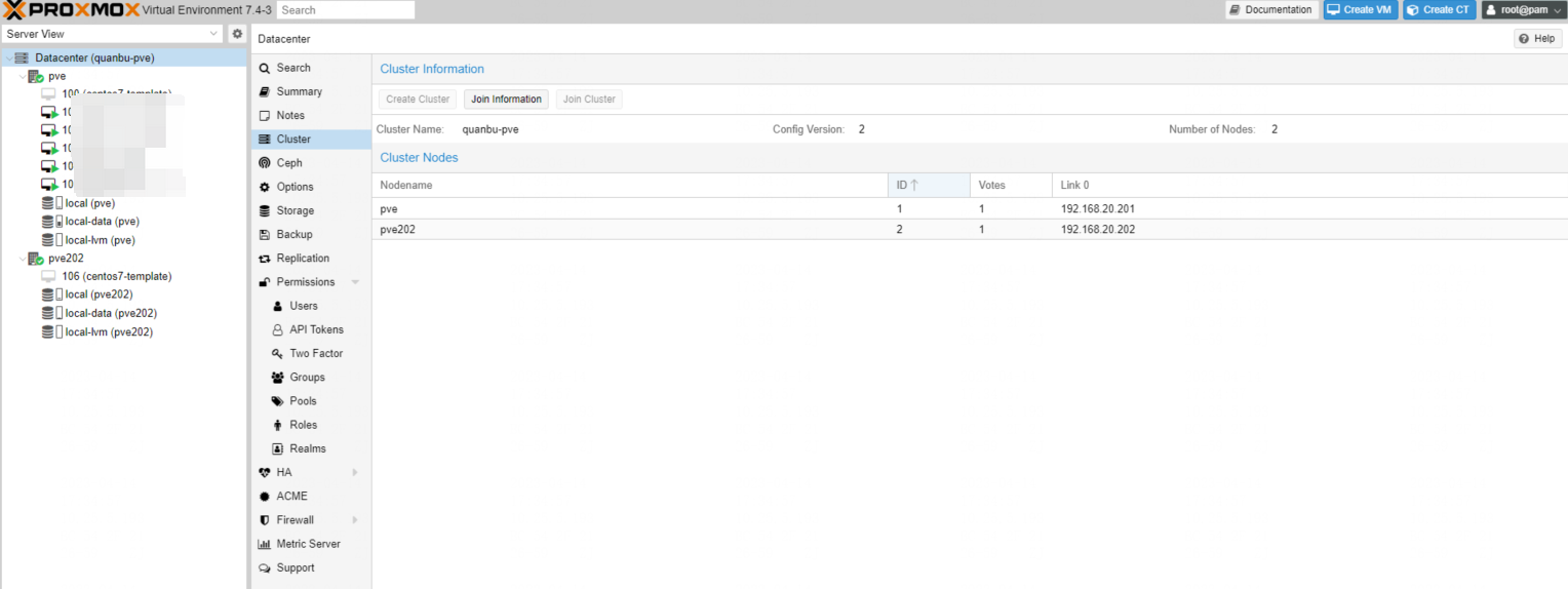 1 2 3 4 5 6 7 8 9 10# pvecm nodes 查看节点,获取节点名称和id # pvecm nodes Membership information ~~~~~~~~~~~~~~~~~~~~~~ Nodeid Votes Name 1 1 hp1 (local) 2 1 hp2 3 1 hp3 4 1 hp4 -